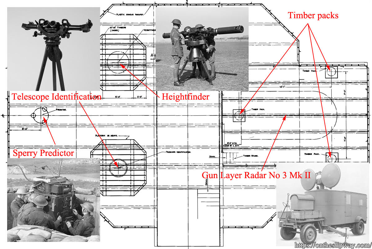 Showing at right the outline of the Gun Layer Radar No3, Mk II, placed in a sponson dropping 4 feet down from the top of the tower. Three timber packs where this truck could place its supports are already indicated on the plans