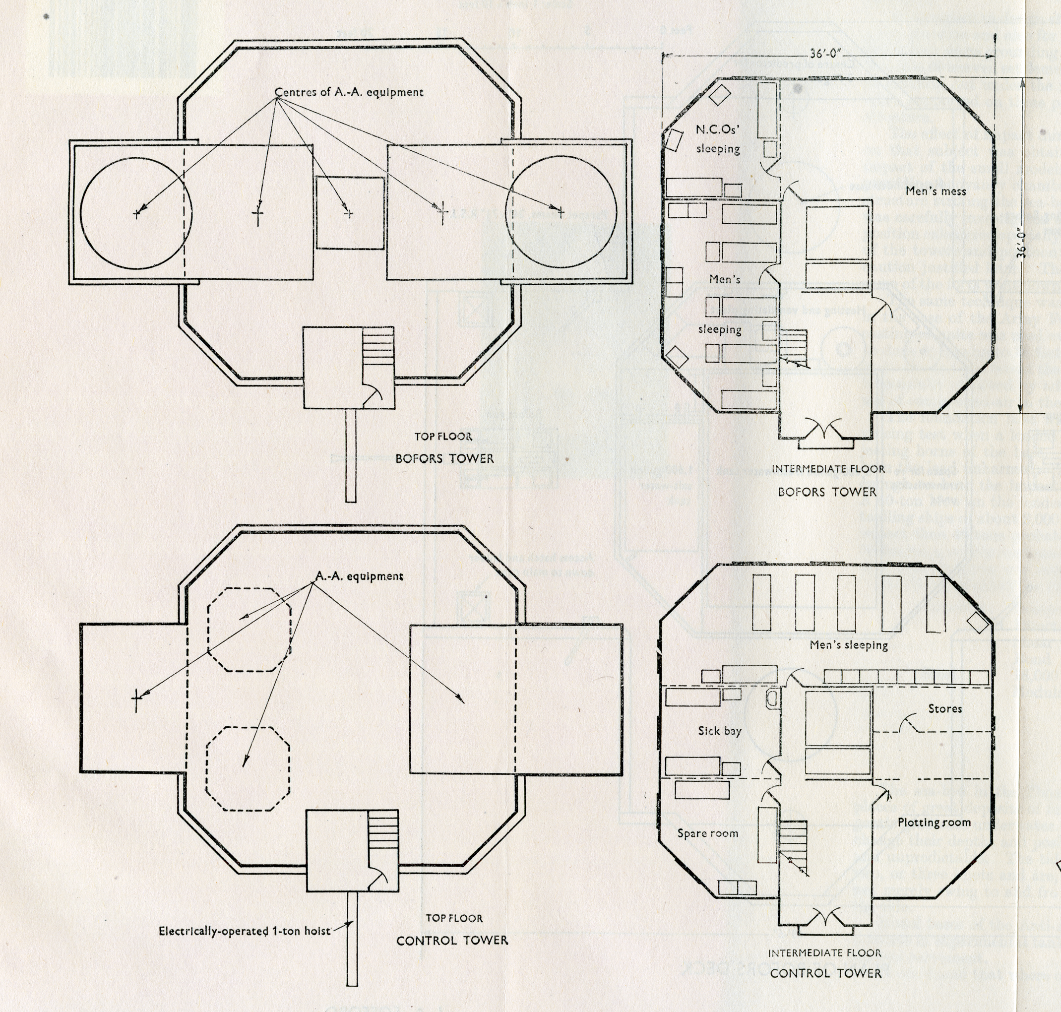 Bofors and Control Towers Bottom Level, Searchlight and 3.7" Gun Tower Top Levels