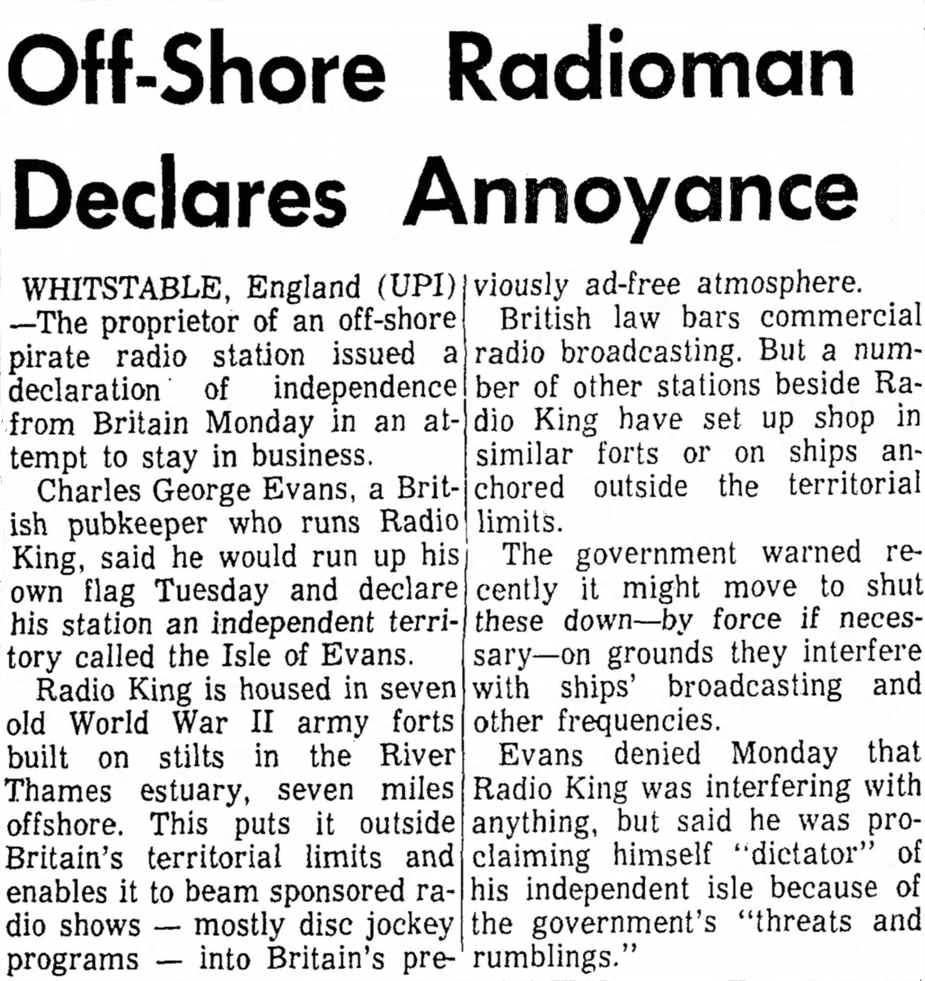 N.B This statement two years ahead of Roy Bates 'Sealand'