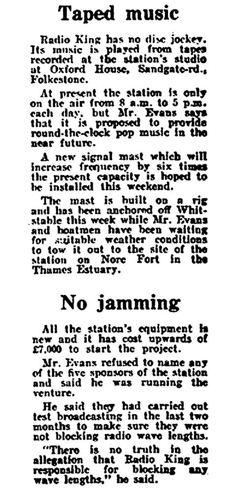 However, they blatently announced, quote: "KING Radio (London) on 238 metres coming from the Nore, where's the Nore?" (no suggestion it was a Fort)