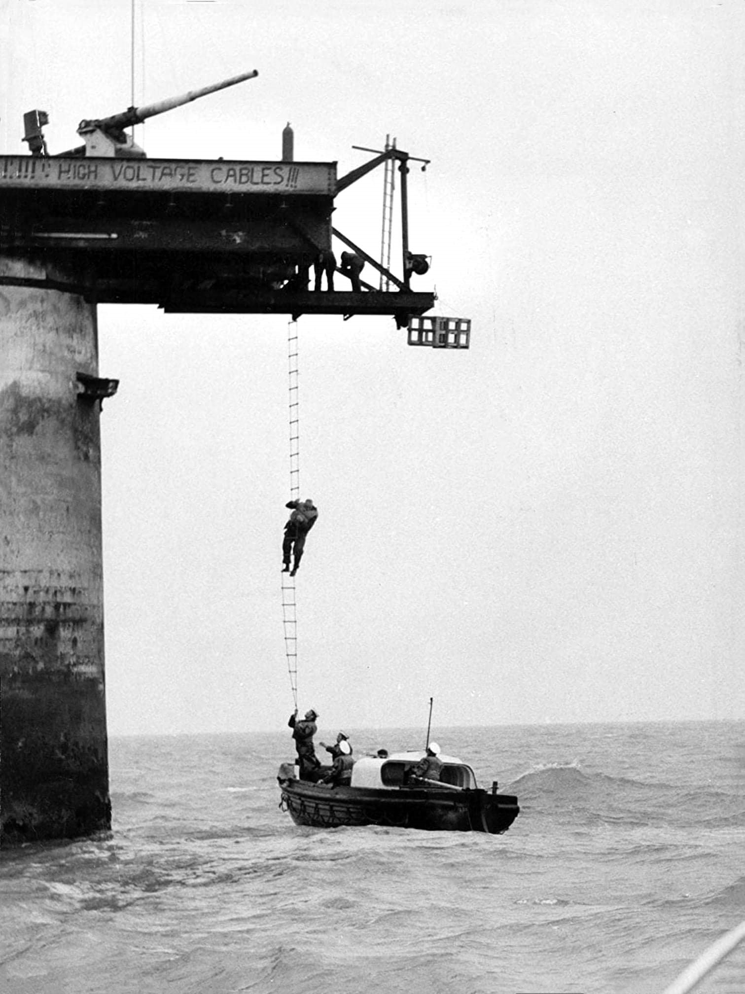 On 21st June 1967 the Offshore II left Harwich with a team of seven men to reclaim the Tower, petrol bombs, oxyacetylene gas cylinders rained down, repelling the Offshore II which pulled away leaving one man dangling from a ladder for some two hours
