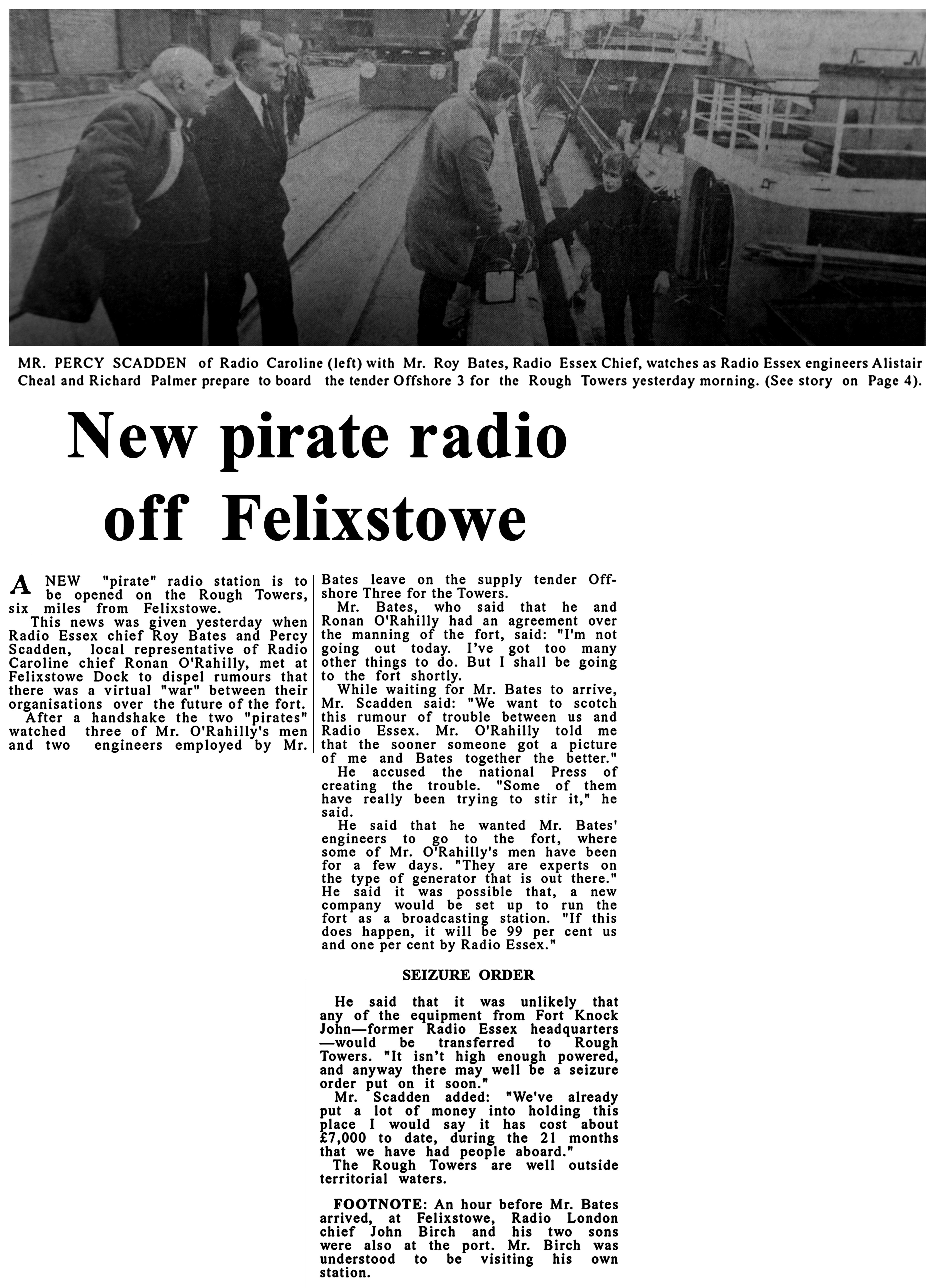 Detail: Percy Skadden, Radio Caroline, Shipping Agent, Roy Bates, Alistair Cheal and Richard Palmer Engineers on 'Offshore 3'- Felixtowe Times (13th January 1967)