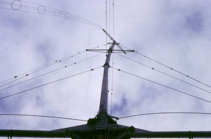 Caroline North Antenna in 1967 top section distorted in a severe gale, new stays were fitted & tensioned but didn't correct distortion (Mike Wright Archive)