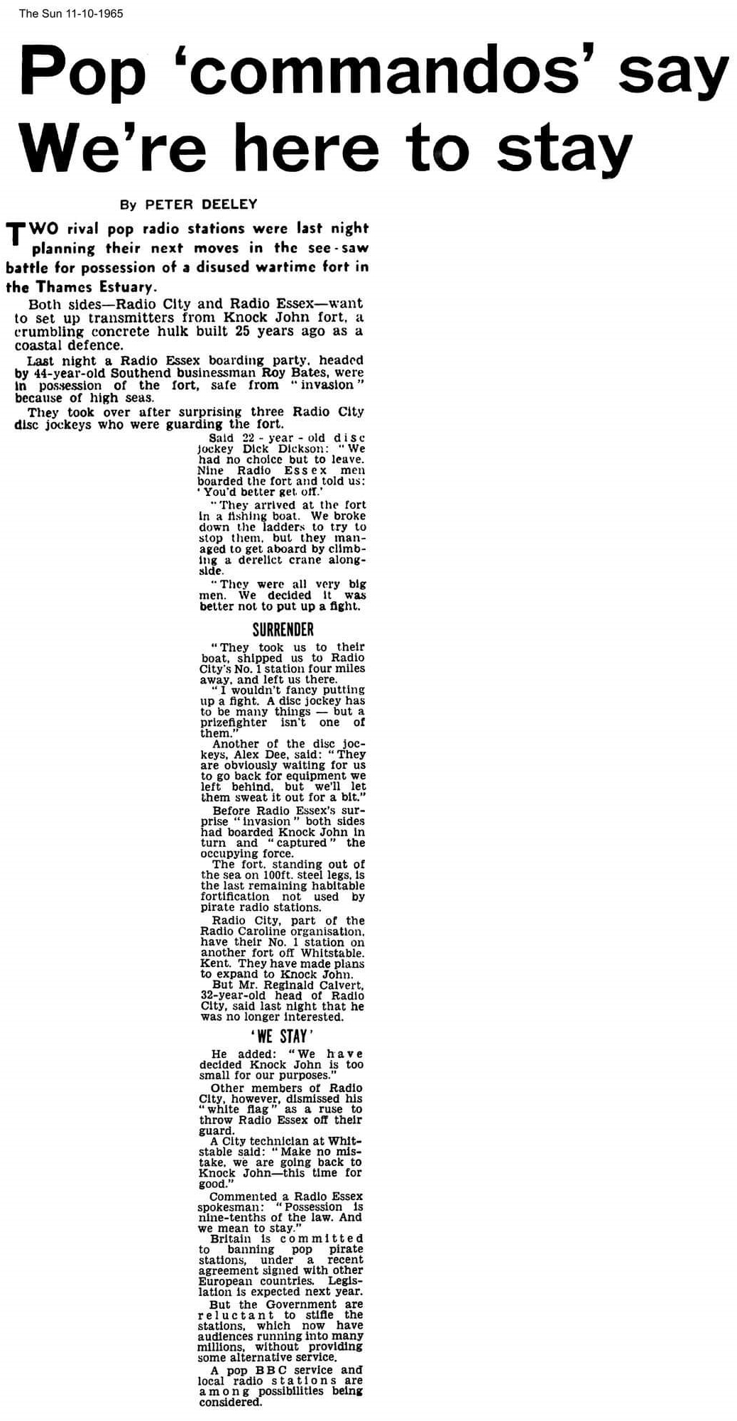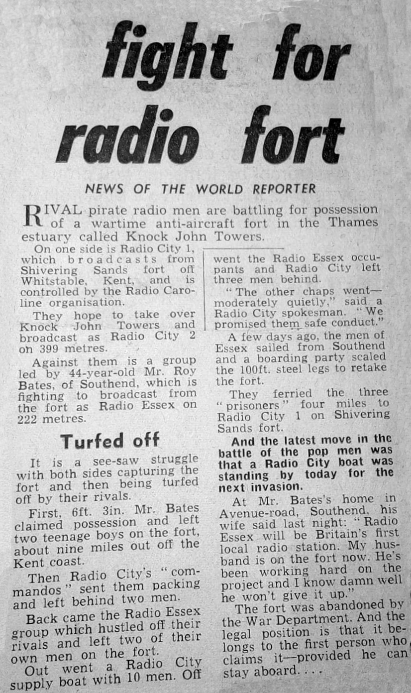 "We saw a boat approaching from Essex and sealed off the access hatches from the leg ladders. Two of us manhandling heavy timber bulks over the hatch plates. The effort was wasted as the boat tied up at the Dolphin and Roy Bates scaled the somewhat precarious structure with ease"